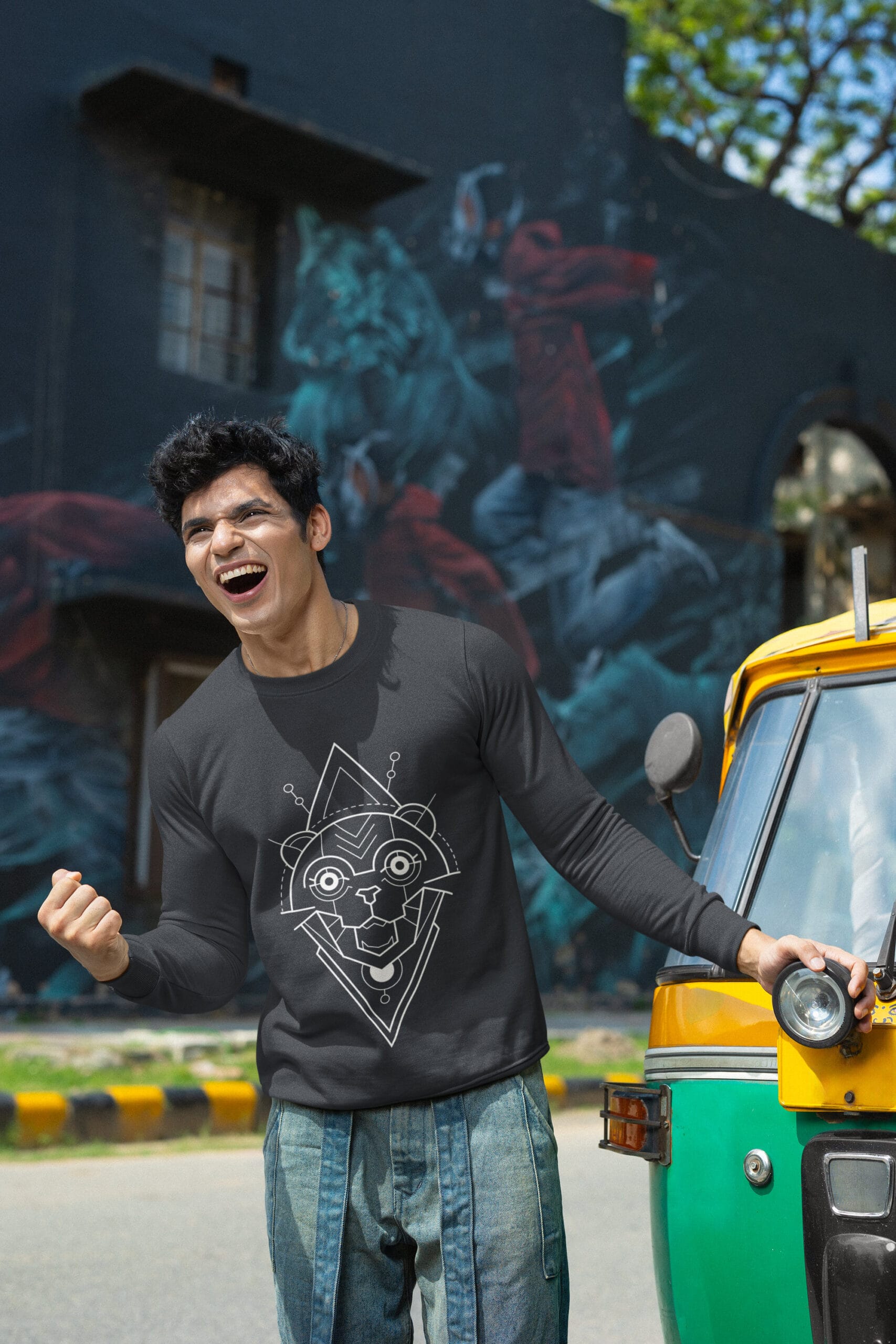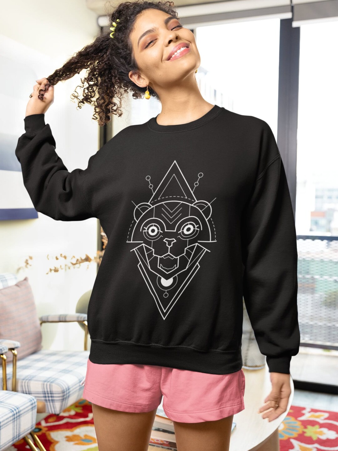 This design reimagines the elegance of a cat using angular white geometry, creating a clean, futuristic silhouette that seems to glow against the fabric. With eyes that know more than they show and a form defined by precision, this feline is a symbol of independence, intelligence, and subtle confidence. It’s style that speaks in whispers but leaves an echo.