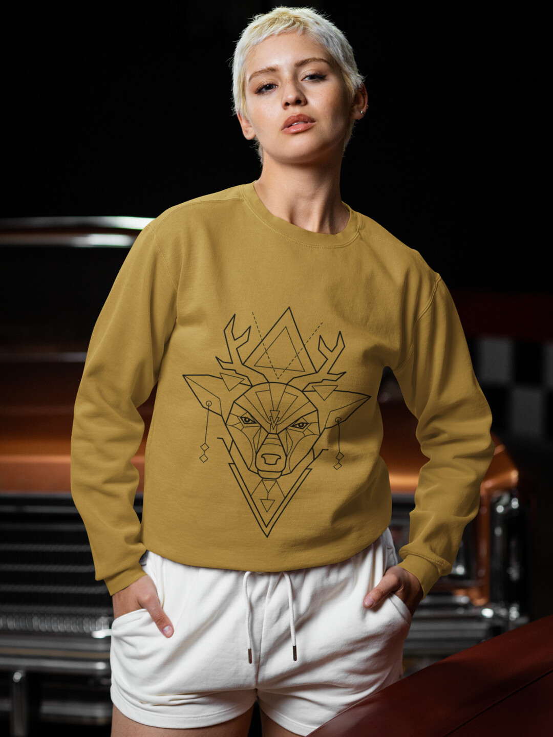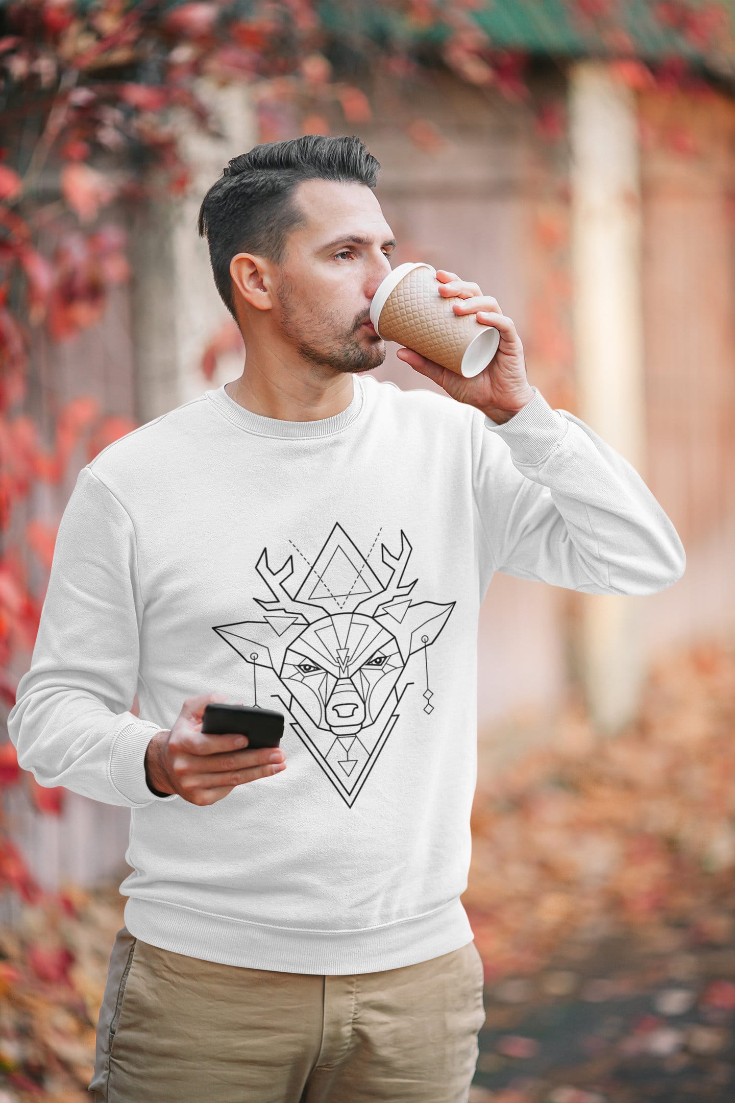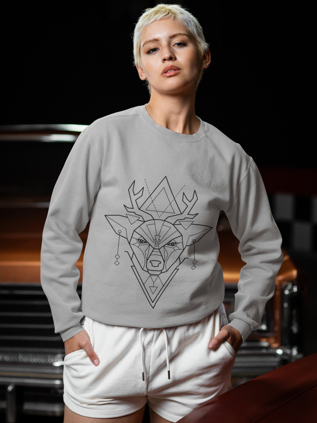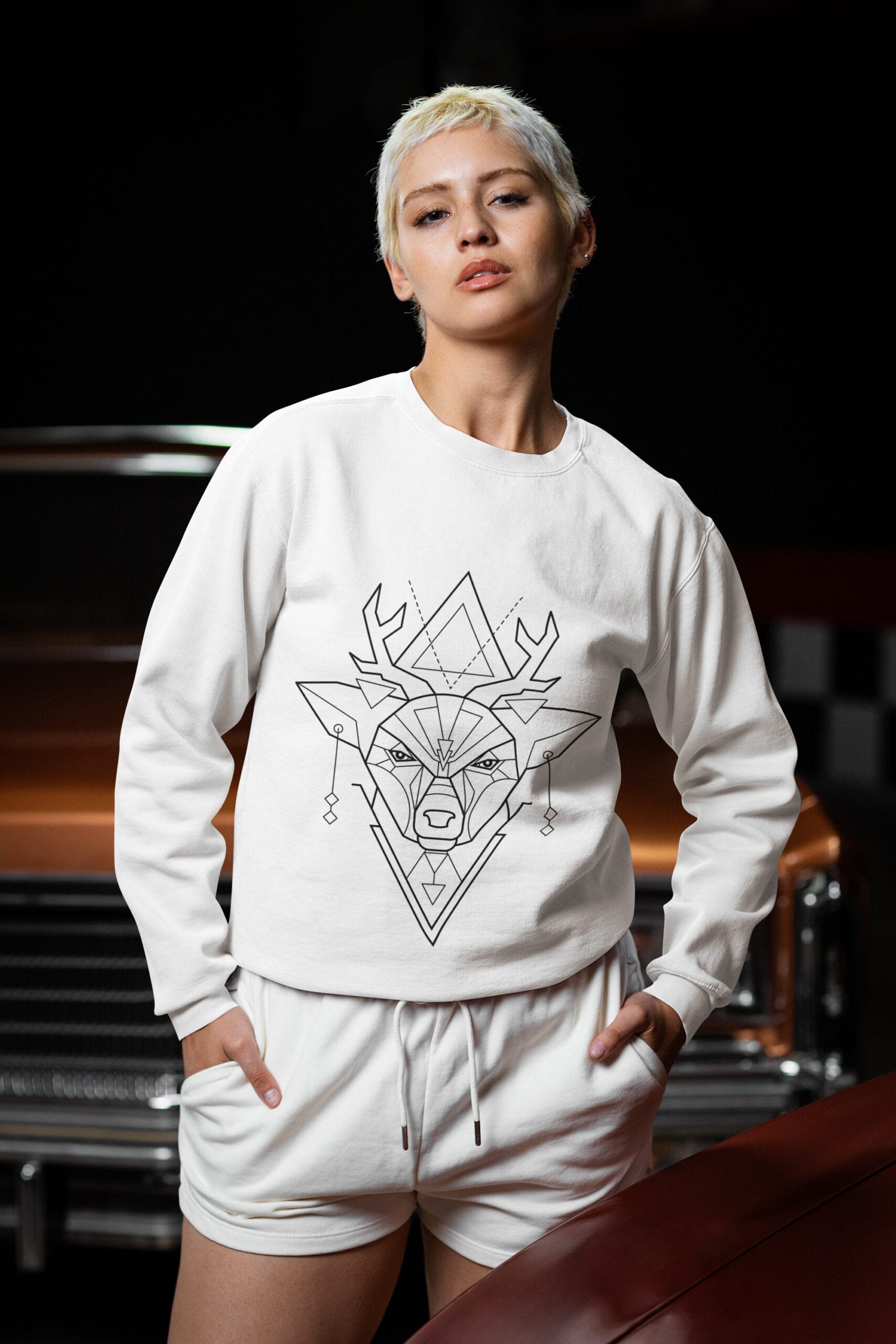 The design captures the majestic form of a deer, rendered in sleek geometric lines that evoke a futuristic, space-age aesthetic. It’s minimalist yet powerful – a symbol of calm confidence and untamed spirit. Whether you’re in motion or at ease, this sweatshirt turns heads with subtle sophistication.