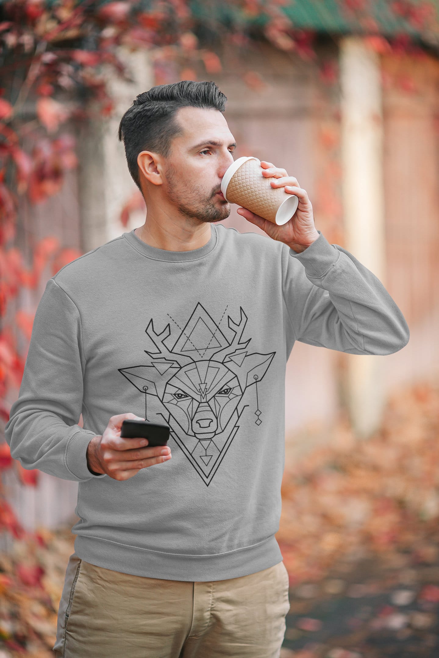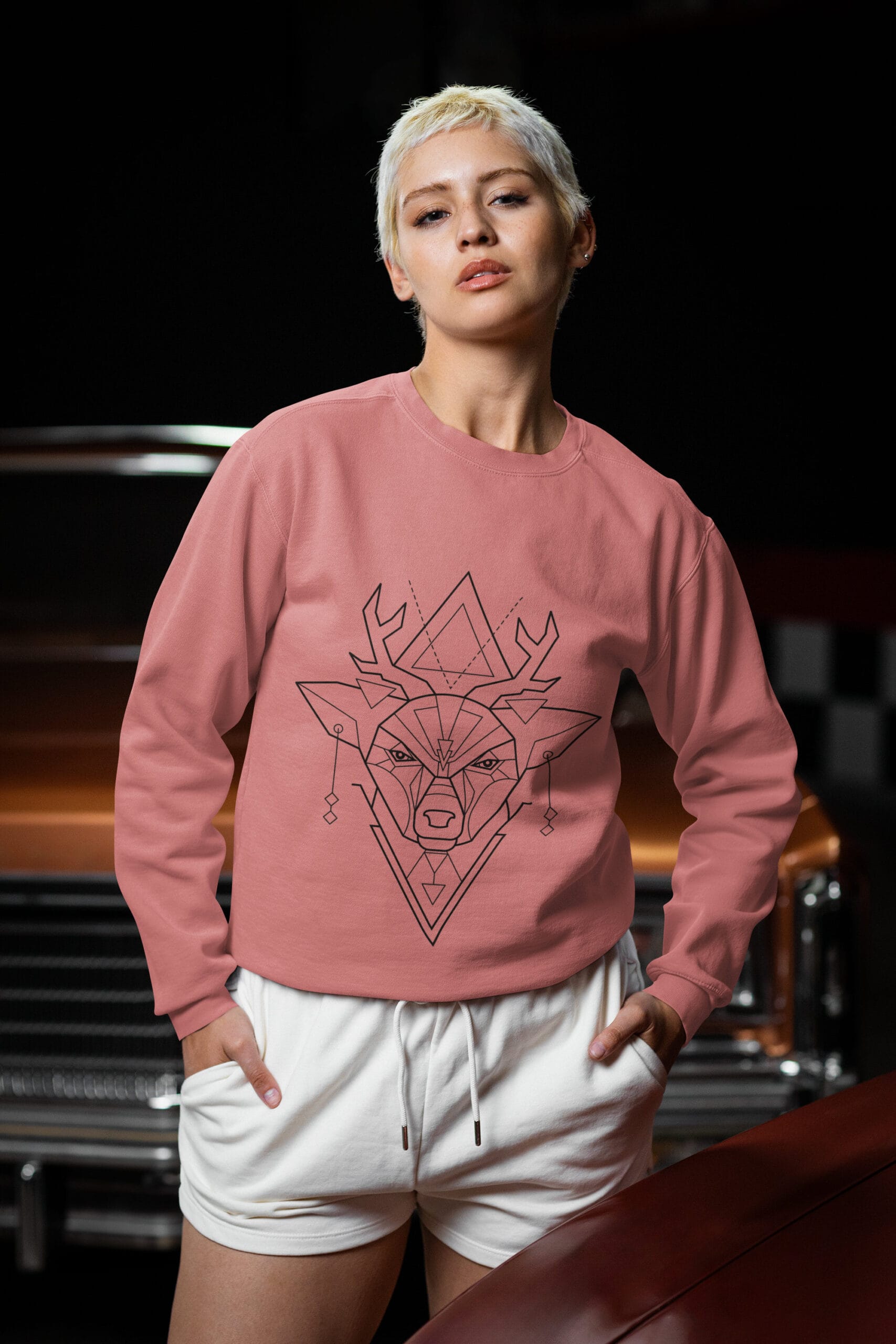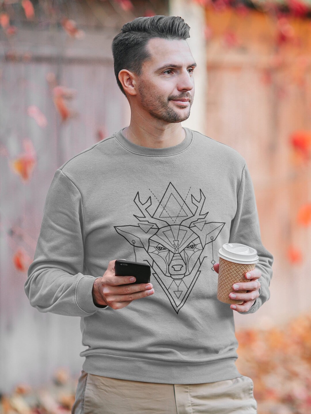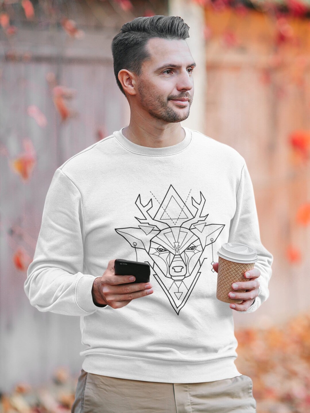 The design captures the majestic form of a deer, rendered in sleek geometric lines that evoke a futuristic, space-age aesthetic. It’s minimalist yet powerful – a symbol of calm confidence and untamed spirit. Whether you’re in motion or at ease, this sweatshirt turns heads with subtle sophistication.