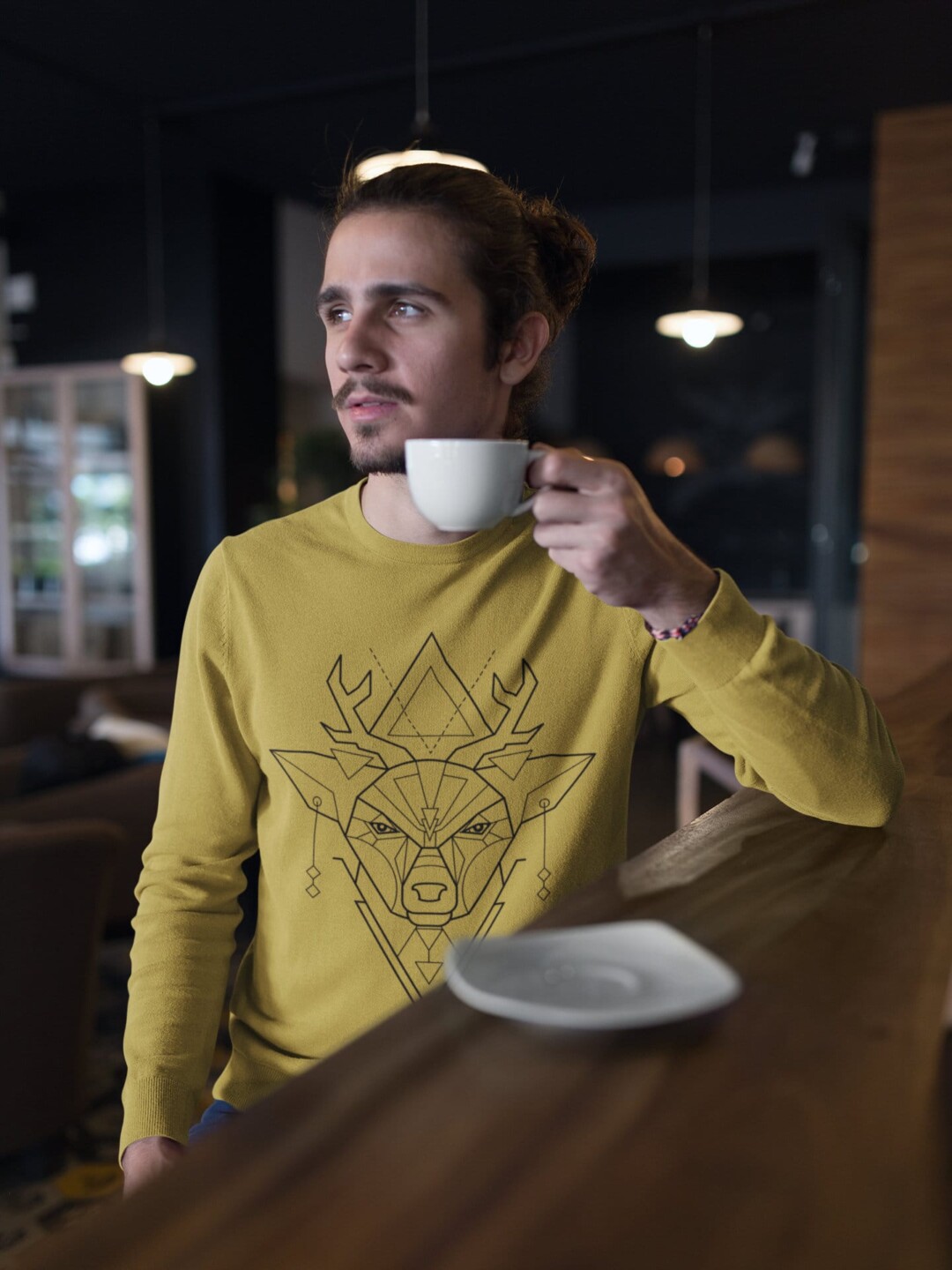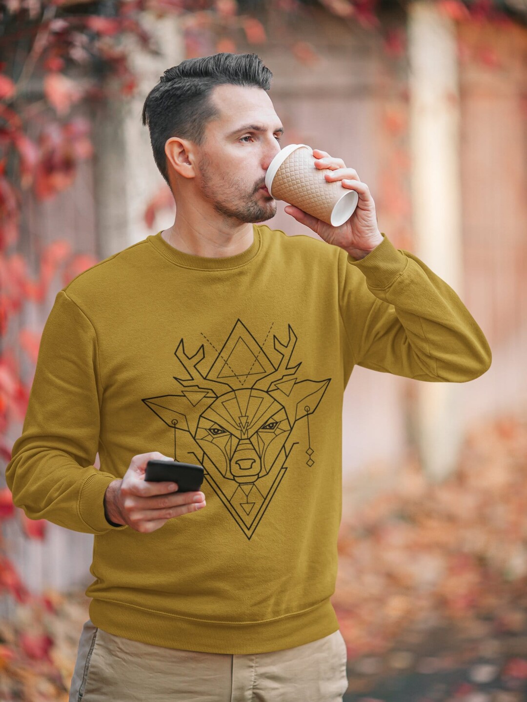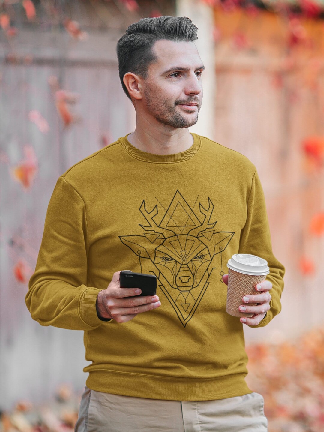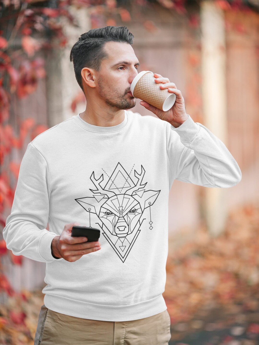 The design captures the majestic form of a deer, rendered in sleek geometric lines that evoke a futuristic, space-age aesthetic. It’s minimalist yet powerful – a symbol of calm confidence and untamed spirit. Whether you’re in motion or at ease, this sweatshirt turns heads with subtle sophistication.
