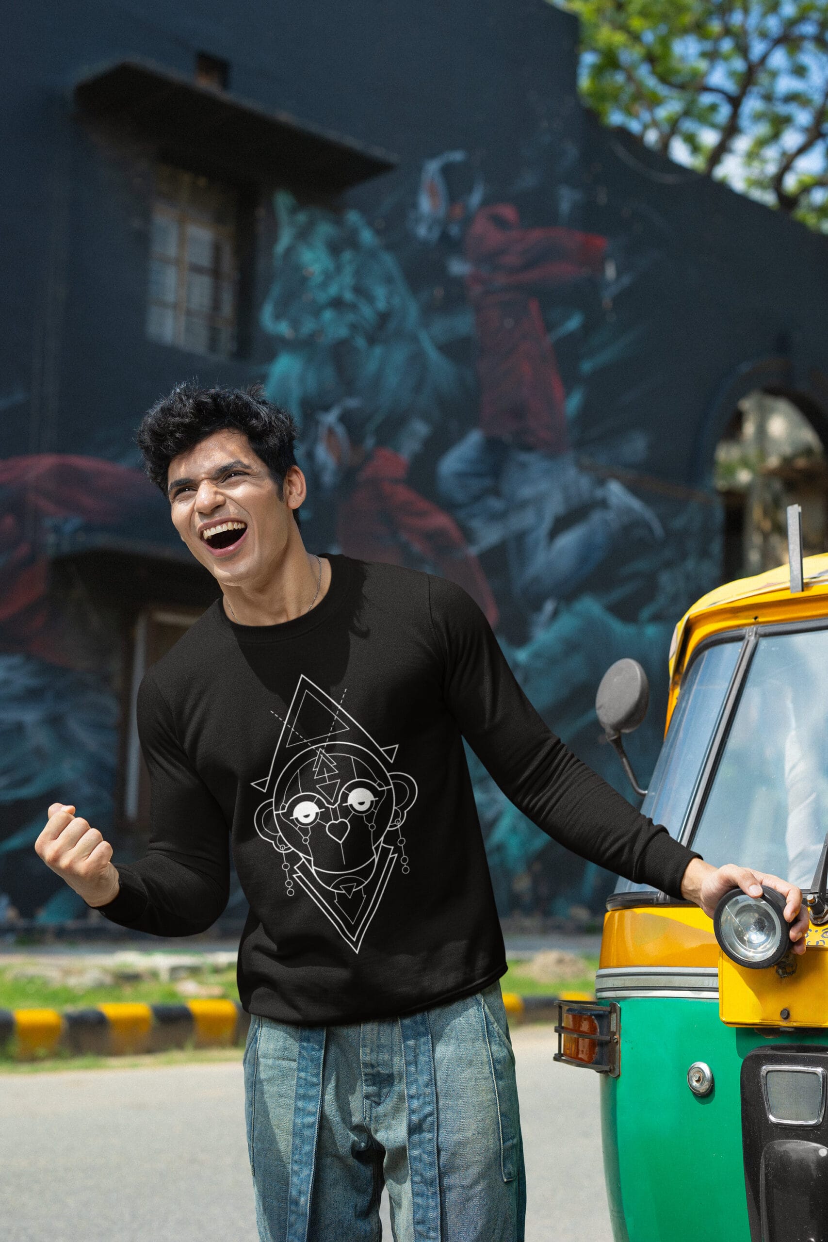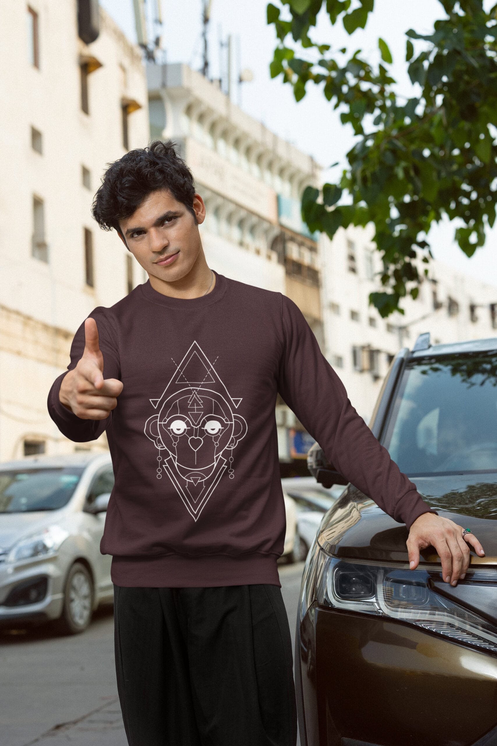 The design captures the playful genius of the monkey through clean, angular white geometric lines. Against the deep fabric, the contrast is sharp and striking—like an illuminated idea in motion. It’s clever, rebellious, and loaded with personality. This piece doesn’t just make a statement—it outsmarts the ordinary.